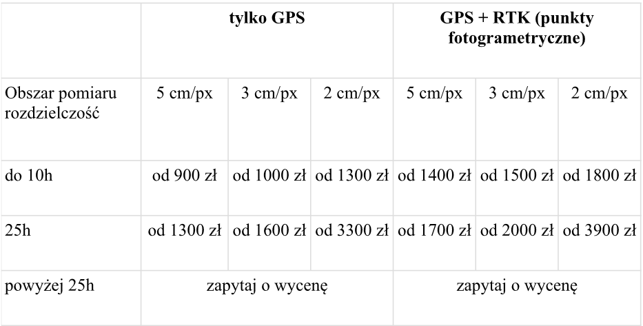 W tabeli obok przedstawiono przykładowe ceny na wykonanie ortofotomapy z uwzględnieniem wielkości obszaru opracowania, rozdzielczości piksela terenowego oraz zastosowanej dokładności.*Podane ceny są szacunkowe. Ostateczna cena zależy od kilku czynników, w tym od kształtu i rodzaju terenu, a także od wymaganych parametrów (pokrycie podłużne i poprzeczne). Ze względu na przeszkody terenowe, osiągnięcie rozdzielczości poniżej 3 cm/px może nie być możliwe na każdym obszarze.